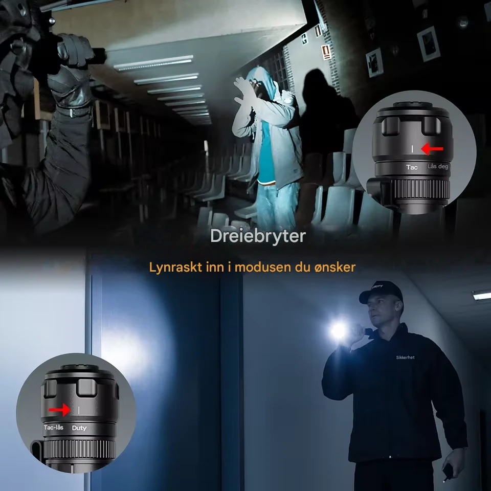 Betjeningen er enkel: bakre avtrekker gir rask på/av og momentary-on, mens roterende bryter lar deg velge ønsket modus uten å måtte gå gjennom alle nivåene. Denne kombinasjonen fungerer spesielt godt ved oppgaver som krever både hurtighet og presisjon — for eksempel inspeksjon under bilen eller belysning av et telt under kveldstid.