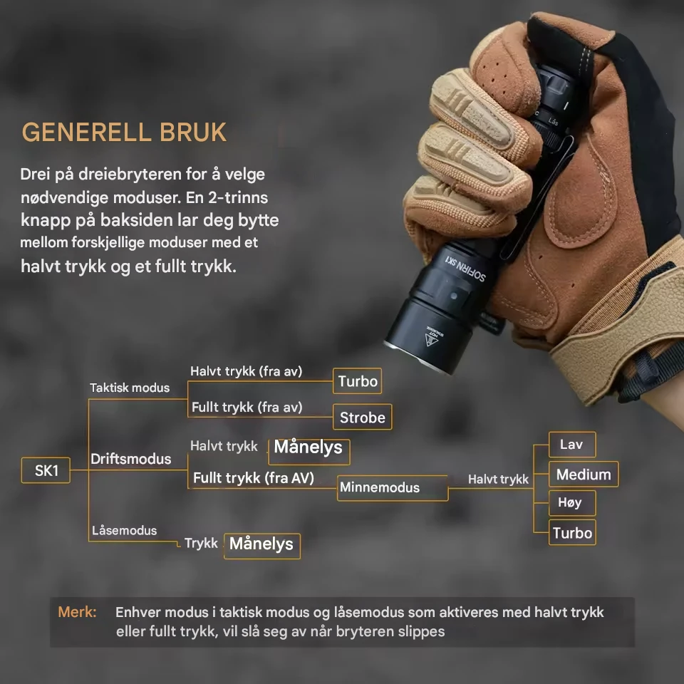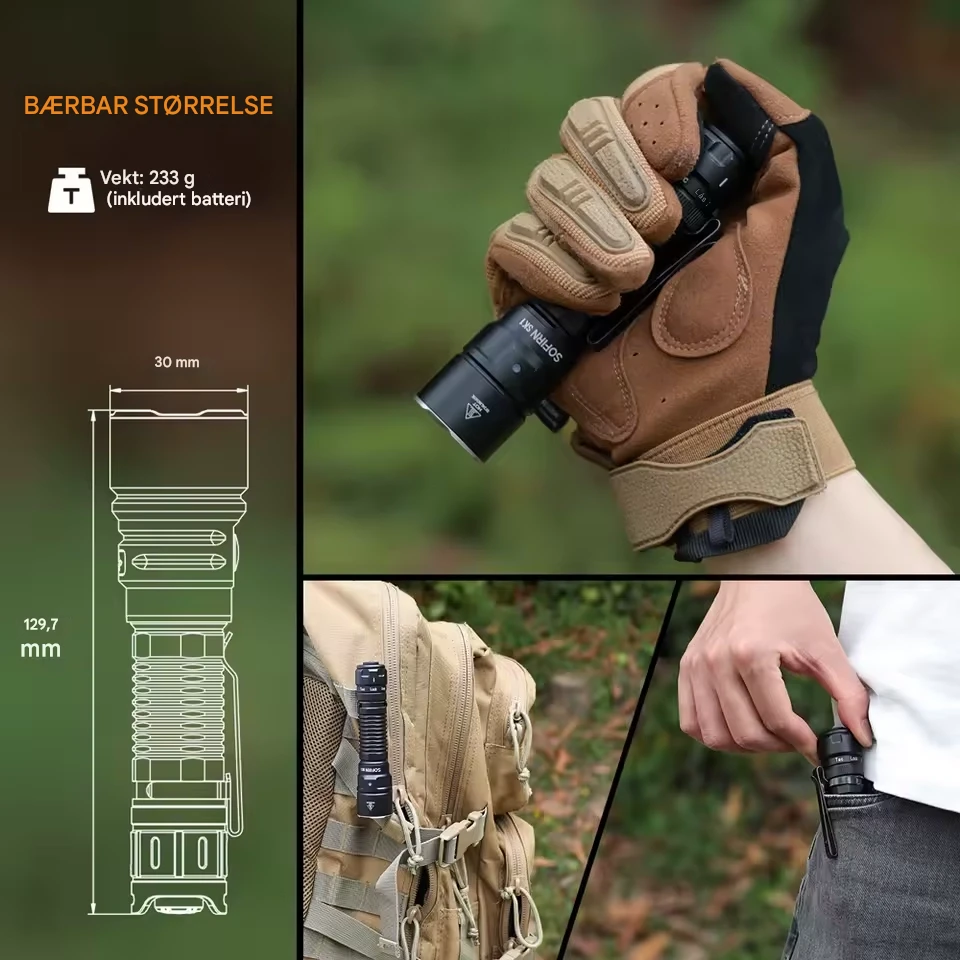 Sofirn SK1 taktisk lommelykt er laget for deg som ønsker pålitelig, høy ytelse i et håndterlig format. Med maks 1300 lumen fra én kraftig LED gir SK1 en fokusert stråle som rekker lenger enn en vanlig kompaktlykt, samtidig som den er enkel å bruke og bære. Hodets diameter er 30 mm, og total lengde er 129,7 mm — liten nok for EDC, men stor nok for praktisk rekkevidde.